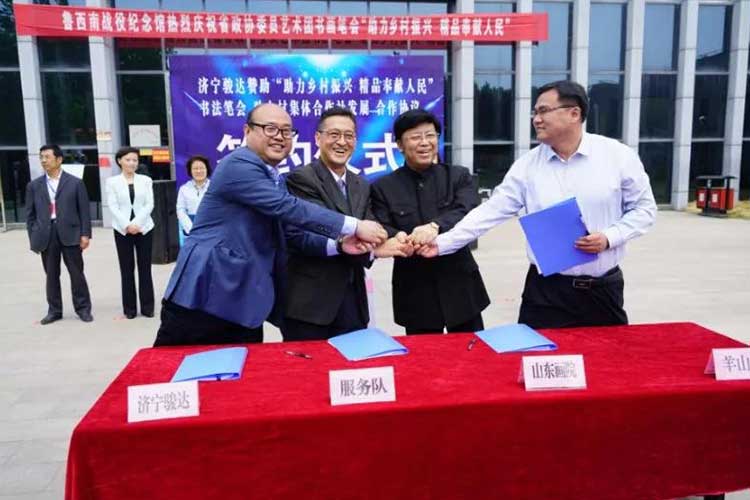 省政協(xié)委員藝術(shù)團(tuán)與山東畫院等組織方,濟(jì)寧駿達(dá)機(jī)械制造有限公司,省派金鄉(xiāng)縣鄉(xiāng)村振興服務(wù)隊(duì),金鄉(xiāng)縣羊山鎮(zhèn)政府四方簽署合作協(xié)議書。